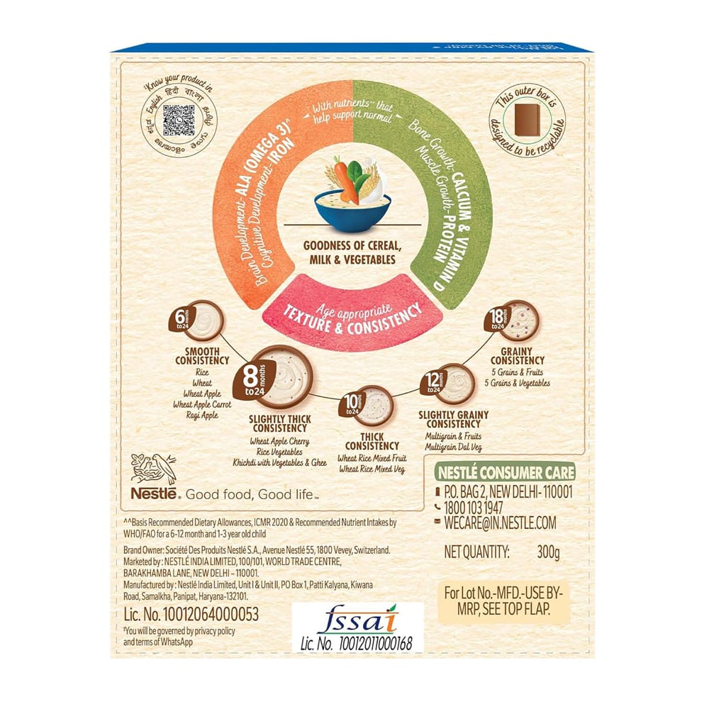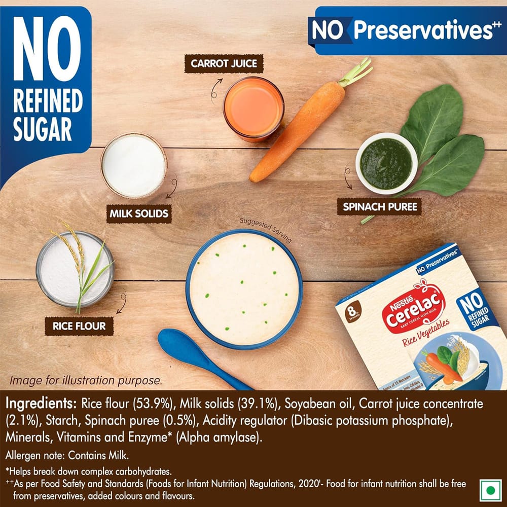 Nestl CERELAC Fortified Baby Cereal with Milk, Rice Vegetables is a complementary food for babies from 8 months onwards. While infants and children have higher requirements of nutrients than adults, 2 serves of CERELAC Rice Vegetables Cereal provides 75% of a baby s daily need of iron. Also a source of 18 important nutrients including vitamins and minerals, CERELAC Rice Vegetables Cereal is free from added colours, flavours and preservatives. Nestl develops infant nutrition products backed by evolving science and research. Innovation has been at the heart of Nestl since its beginning. Optimal Preparation: Careful and hygienic preparation of Infant food is most essential for health. Do not use fewer scoops than directed, since diluted feeding will not provide adequate nutrients needed by your infant. Do not use more scoops than directed since concentrated feed will not provide the water needed by your infant. Storage: After opening the pack, the contents should immediately be transferred to an empty, clean and dry airtight container. Replace the lid tightly after every use and store in a cool, dry place. Ensure enclosed scoop is thoroughly washed and dried before use. After opening, use the contents within 3 weeks or the expiry date, whichever is earlier. Important Notice: Mother s milk is best for your baby. Safety Warnings: Infant food shall be introduced only (after the age of 6 months up to the age of two years). Infant food should be used only on the advice of a health worker as to the need for its use and the proper method of its use. Infant food is not the sole source of nourishment for an infant. Use prepared feed within half an hour otherwise microbial deterioration may set in. Discard unused feed.
