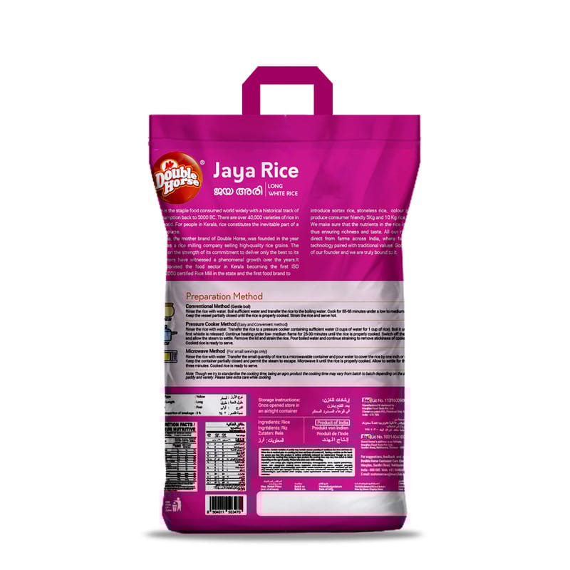 Short description: Double Horse Jaya Rice (5 kg) is a carefully selected rice variety that cooks into separate, non-sticky grains. It s suited for daily meals and special dishes from plain steamed rice to pulao, biryani and fried rice.