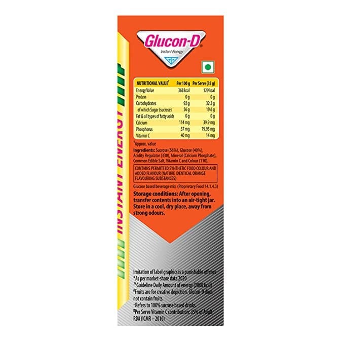Summers can be daunting and especially when there's an enormous scorching sun always ready to drain out your energy and stop you from being the best of you. But thank god there is Glucon-D! Glucon-D contains glucose that helps replenish body glucose and fills you with the energy required to stay active. It is easily absorbed by the body, thus giving out an instant energy boost and refreshment. Enriched with Vitamin-C and Minerals, including Calcium and Phosphorus, this glucose drink helps charge you up to fight tiredness and promotes mental alertness. What's better? Added Orange flavour makes it loved by children as well as adults. Add Glucon-D to a glass of water every day to provide growing active children the energy that keeps them going and adults, refreshment after a long day.